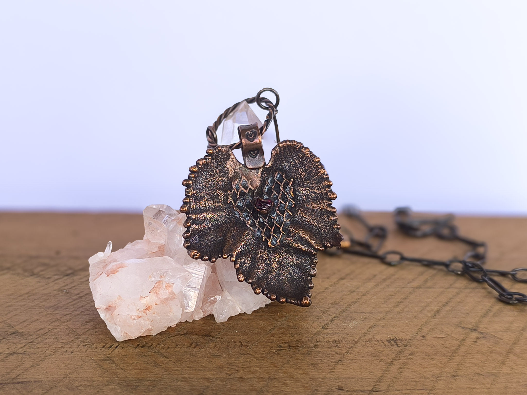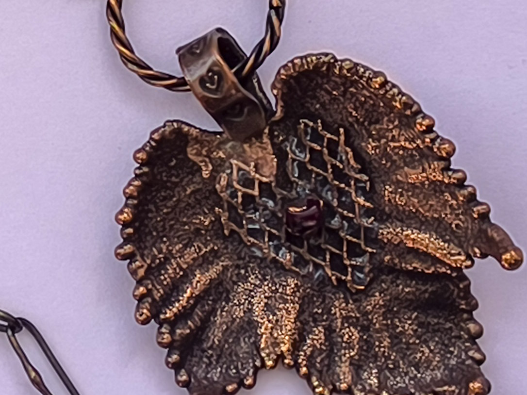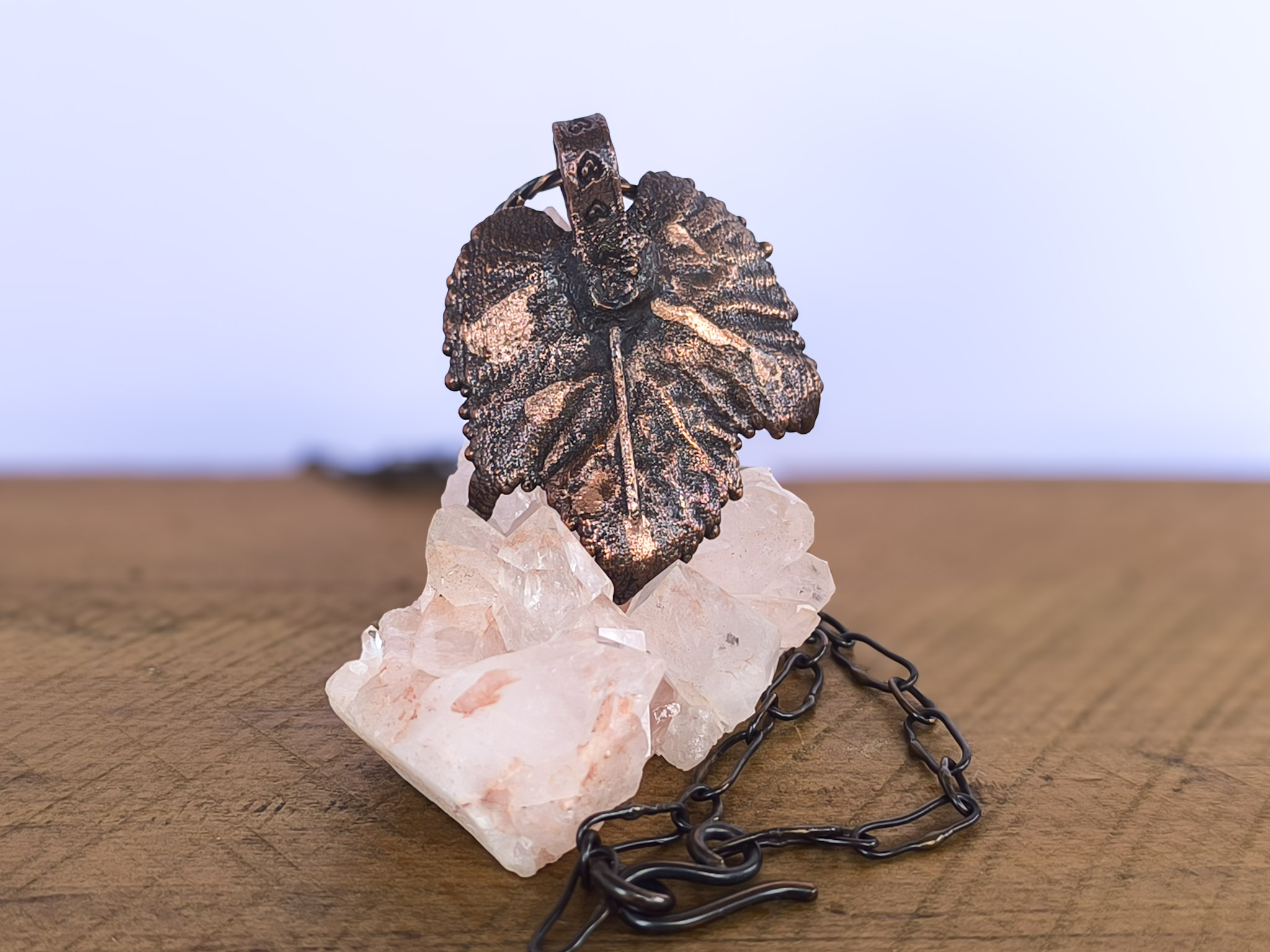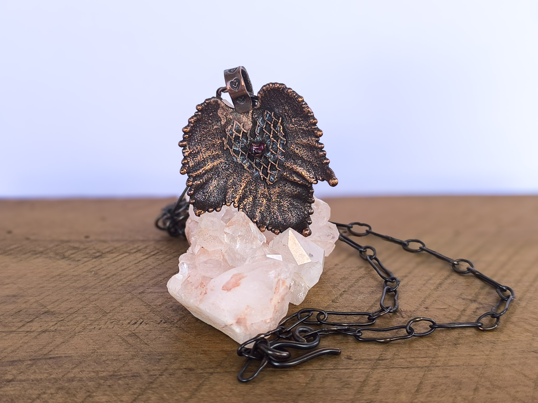 This unique pendant is crafted from a real grape leaf, electroformed in copper to preserve its natural beauty and intricate detail. At the center rests a deep red garnet, symbolizing passion and protection. The pendant hangs from a handcrafted copper chain, giving it a rustic, organic feel.